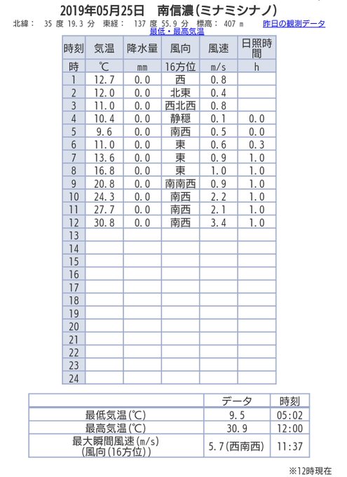 2019年05月25日 南信濃(ミナミシナノ) 5月25日12時の観測データ - https://t.co/ReQKQUhUL1