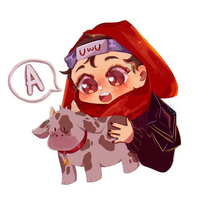 @MomonKun_ con la vaquita, gracias por la foto uwu. CAMBIÉ EL DISEÑO y realmente no sé si me convence. Iré variando en cuanto diseños hasta que me sienta cómodo con alguno 🤧. #TortillaLand #momonkun