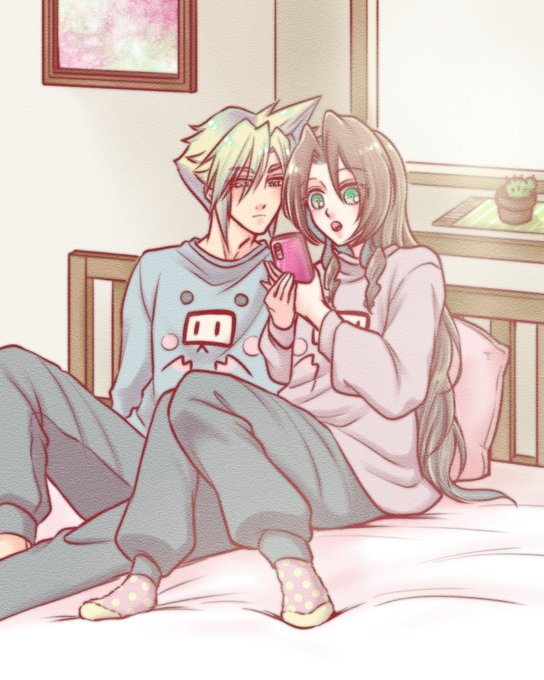 土曜日の午前はベッドでまったりする二人♡(*´ω`*) 昨日のクラエアなんですが、クラウドがエアリスのお腹さすってる様に見えませんか?('ω') #FF7R #クラウド #エアリス
