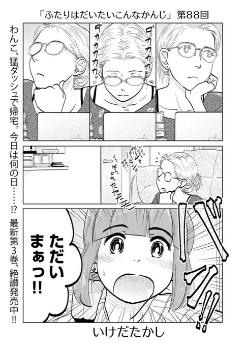 只今公開中第88回はラブラブメガネ回!!来て見て読んでね広めてね33歳脚本家と23歳新人声優女と女のほんわか同棲譚「ふたりはだいたいこんなかんじ」は1回6ページと気軽にお読みいただけるサイズ感!
