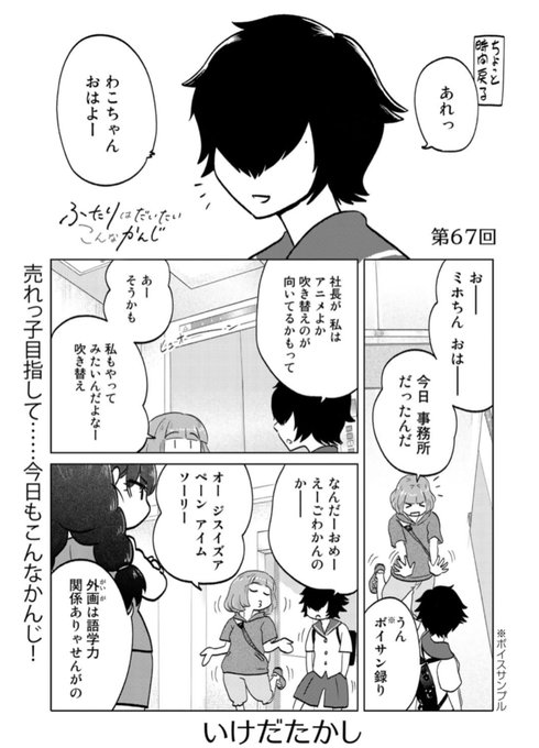 本日更新第67回は声優残酷物語⁉︎来て見て読んでね広めてね33歳脚本家と23歳新人声優女と女のほんわか同棲譚「ふたりはだいたいこんなかんじ」は1回6ページとお気軽にお読みいただけるサイズ感!