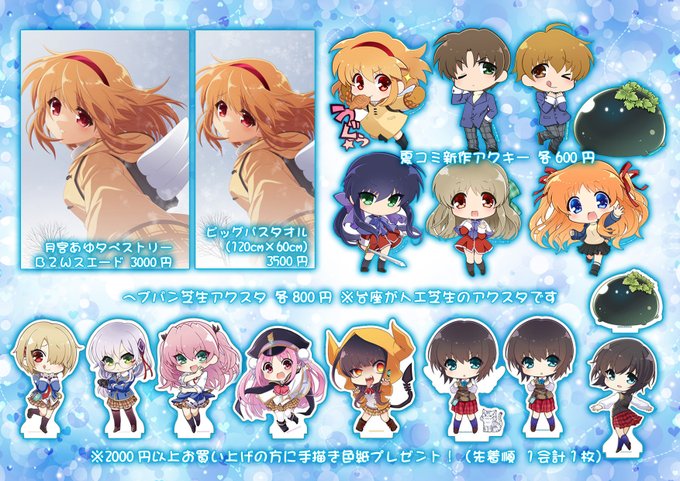 10月23日COMIC1☆21 C04aAQUAQUAのお品書きです。ヘブバンとKanon中心Keyよろずサークルです。当日の新作は気高き子猫棗鈴ちゃんのアクキーです。夏コミとこみトレの新作グッズ沢山種類がありますのでよろしくお願いします!