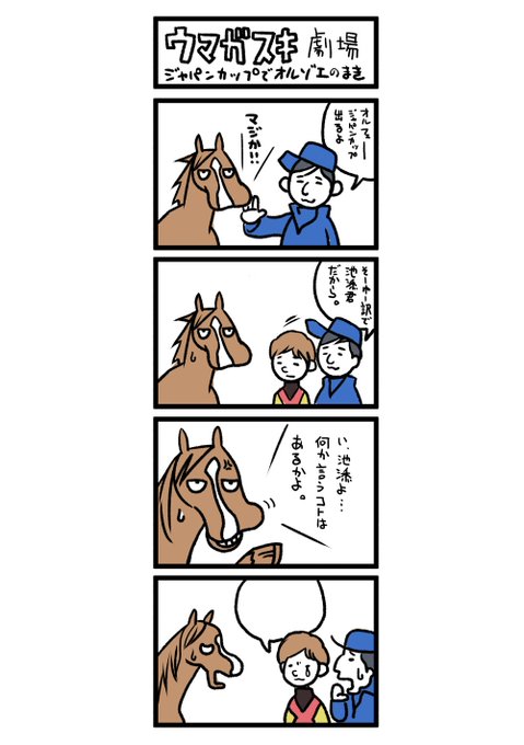 自分の描いた過去の画像ひっくり返してたんだけど、自画自賛だけど、オルフェーヴルと池添騎手のマンガ面白いなーこれ。相当好きだったんだなー。
