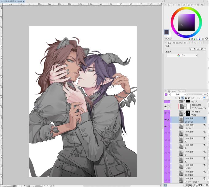 違和感全部無視して適当に影おいて効率重視してるはずなのになんでこんなに時間かかるんだろうと思ったらこれ構図が既に面倒くさいんじゃないかと気づき始めた🫠こっから塗り込んで修正してグラデマップ充てて仕上げに塗り込むだけなのでそんなに時間かからないはずなんだけど今日21日だよね…21…🤢