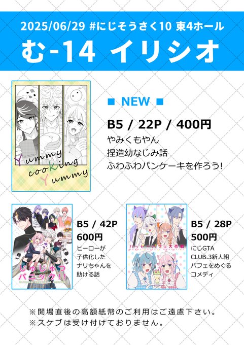 #にじそうさく10 【東4・む14】イリシオ 当日の状況はXでお知らせします ▼新刊 「Yummy cooKing Yummy」 やみくもやん捏造幼なじみ話 ▼既刊 「ハッピーパフェ大作戦」 にじGTA【CLUB.3】新人組パフェをめぐるコメディ 「じゅじゅつパニック!!」 ヒーローが子供化したナリちゃんを助ける話