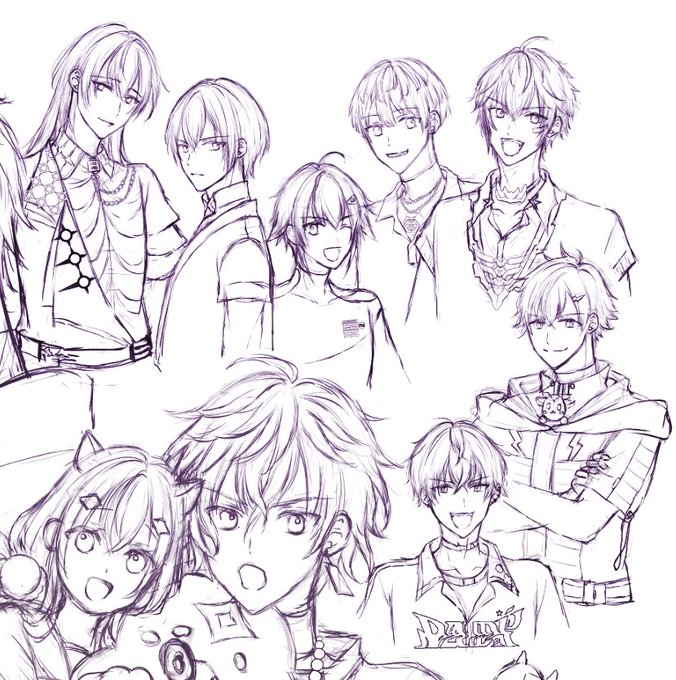 表紙ラフ(内容ネタバレ)wip やみくもやん+ヒーロー本 ディティカ、オリエンス全員入れたくて シュウくんは新衣装で