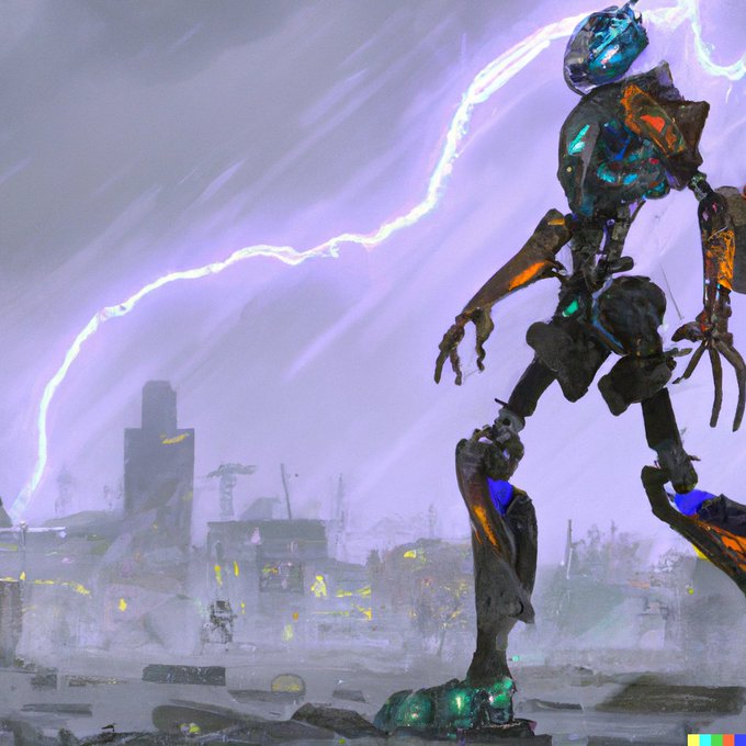 an autonomous two-legged robot patrolling destroyed city during fierce lightning storm, concept art by tyler edlin, studio lighting, trending on artstation