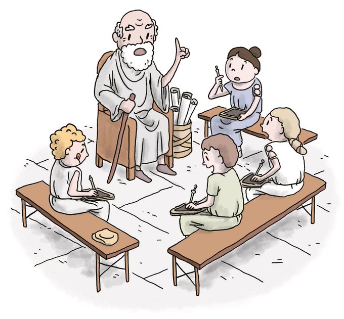 "Os nenos sentábanse en bancos corridos, sen respaldo, chamados sellae ou subsellia, e apoiaban o material escolar sobre os xeonllos para traballar."