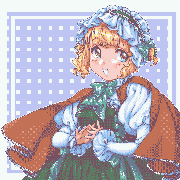i wanted to do a disciplined pixel portrait ,16 colors n all but i screwed the rules by the end w/ the frill trim ofc. ig i learnt a bit