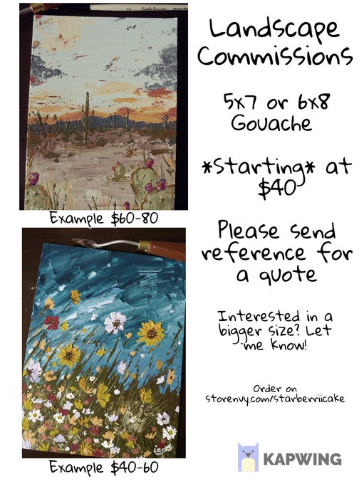 My gouache landscape commissions are now open!! Please DM reference pics/details of what you want so I can quote you which Tier you'll be ordering from! Then go to my storenvy to order! Examples below