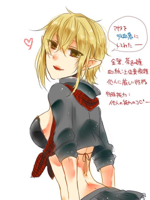 芋明太子は『金髪、茶色の瞳で血統は上位貴族種。他人に厳しい性格で、特殊能力は他人の能力のコピー』です。 http://t.co/Mneg2cDm 描いた