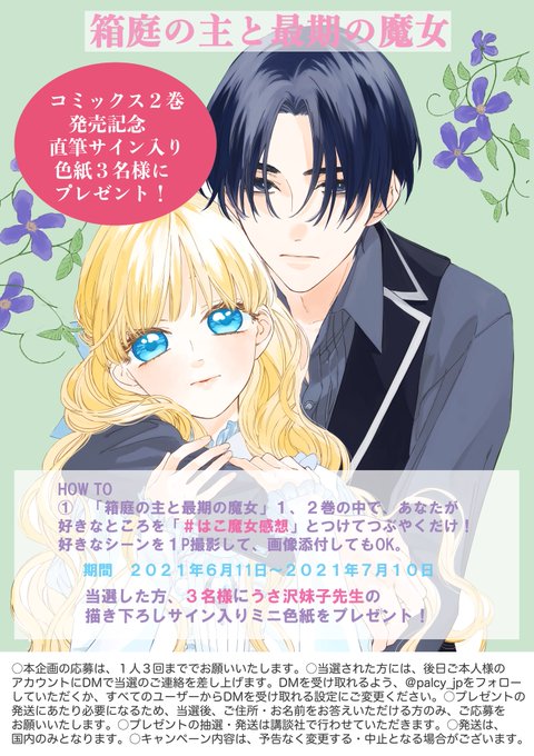 【企画お知らせ】『箱庭の主と最期の魔女』第2巻の発売を記念して描きおろしサイン入りミニ色紙を抽選で3名の方にプレゼントいたします…🐰💕応募方法は箱魔女1巻2巻の中で好きなところや感想を『#はこ魔女感想』のタグをつけて呟くだけです!色紙3枚描きますよ✊詳しくは二枚目の画像をご覧ください🐰