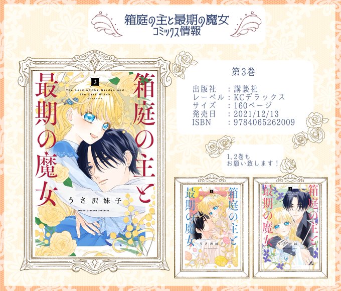【宣伝】『箱庭の主と最期の魔女』3巻(電子・紙両方同じです)の書影が出ましたのでお知らせです🌹予約等の目印にどうぞ!3巻の表紙は最高に可愛くして頂きましたありがとうデザイナーさん担当さん…☀️紙の方は書店さん等で予約された方が確実かと思います。電子紙共にどうぞよろしくお願い致します🐰