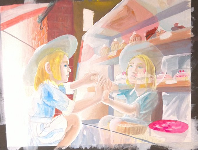 ケーキとガラスに写る女の子、ガラスの奥の(?)