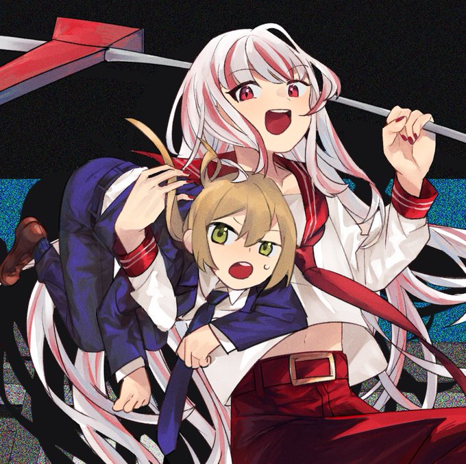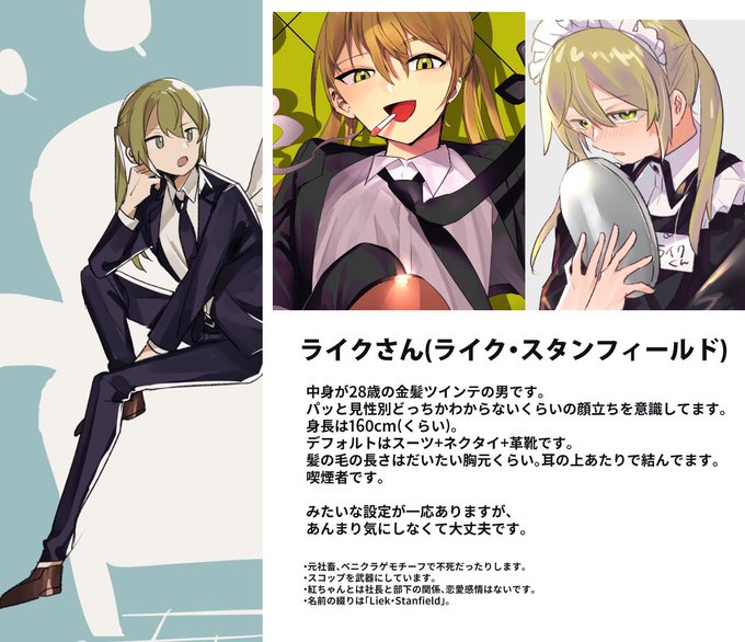 企画参加失礼します~!金髪ツインテスーツの男(実年齢28)とヒール込みで2mの強い女がわちゃわちゃする絵を描いています #フォロワー1000以下の一次創作作家発掘フェス