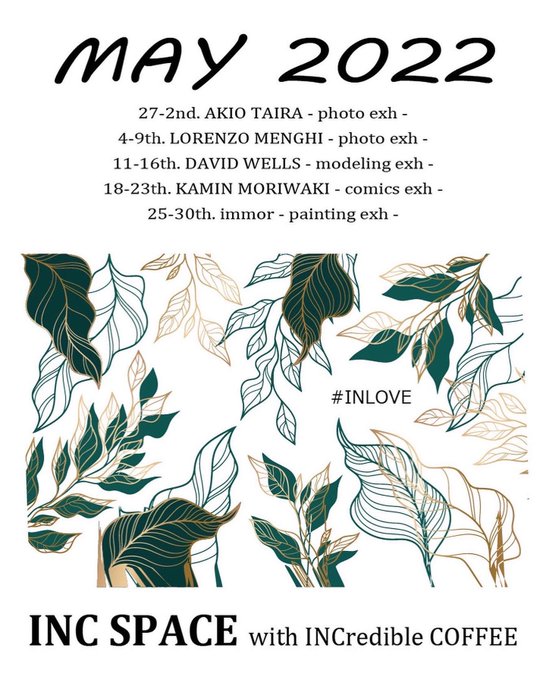 ■5月のスケジュール 27-2nd. AKIO TAIRA - photo exh - 4-9th. LORENZO MENGHI - photo exh - 11-16th. DAVID WELLS - modeling exh - 18-23th. KAMIN MORIWAKI - comics exh - 25-30th. immor - painting exh -