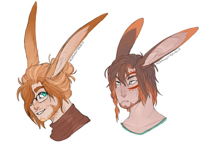 @kissfortheelves Vhir and Redde! formerly coworkers now dating. Redde is charming and a huge flirt but secretly kind of a dork, whereas Vhir is easily flustered and excitable. They tease each other a lot but it stems from a place of fondness,