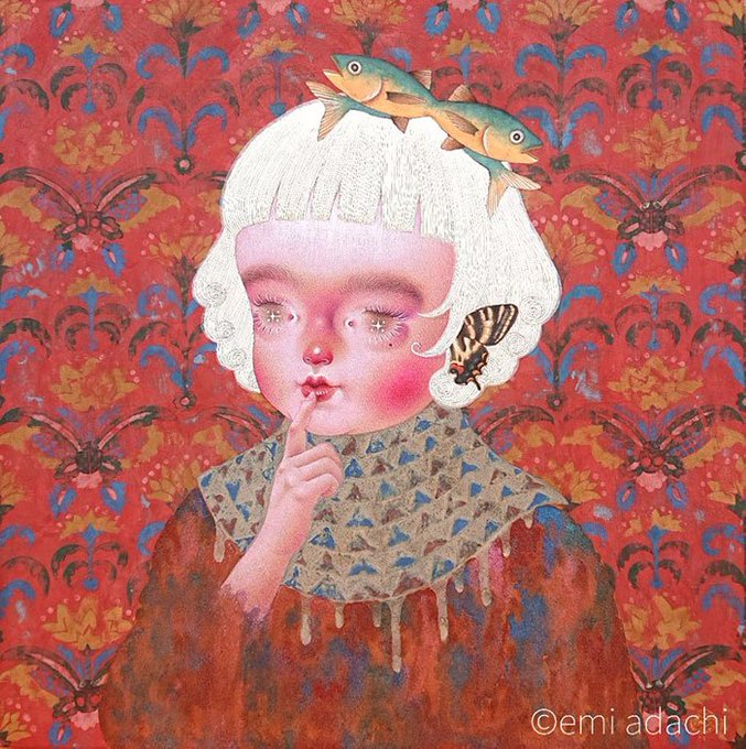 1991年生まれ。アクリルを用いたファンシーな色彩で、ドレスを身にまとい、おとぎ話ような可愛らしい世界にたたずむ少女たちを描いています。
