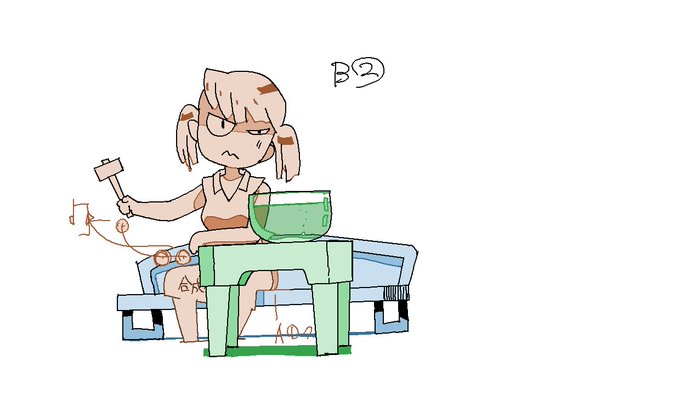 いっぽう、色指定さんの「打ち込み(色指定)」は、例のようにそのカット内にでてくる事物の実際の色(昔なら絵の具の番号)を仕上スタッフに指示する指示書き。