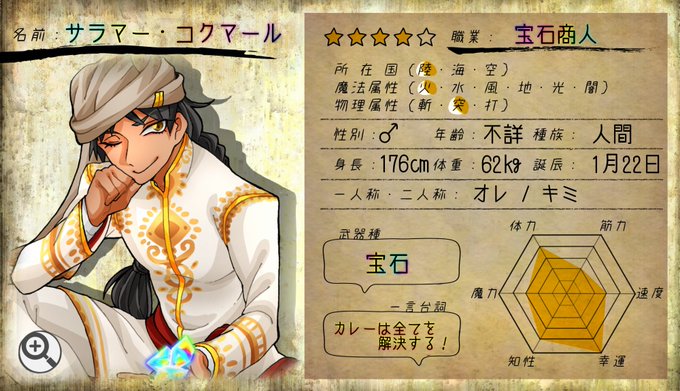 【キャラクター紹介】現在開催中の期間限定イベント『スパイスウィズジュエリー ~華麗なる探究物語~』にて特定のミッションをクリアすると☆4「サラマー・コクマール」が仲間になります。パーティに加えてカレーの人と共にクエストに挑もう! #イノボ #スパイスウィズジュエリー