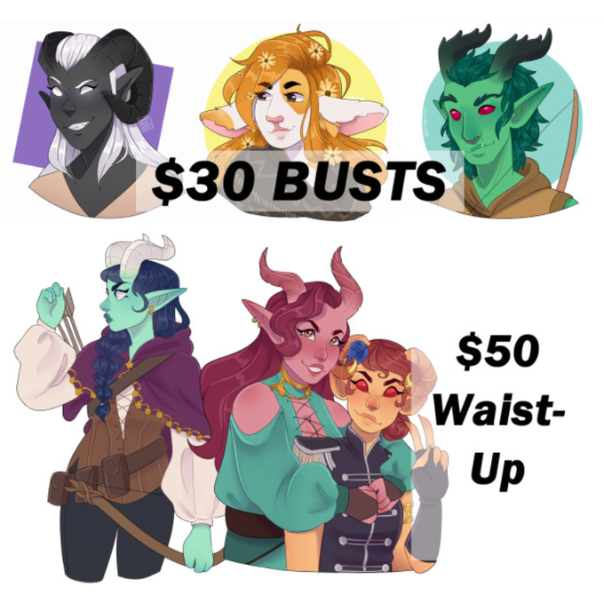 New prices and new examples of work from the past year!! I've been venturing with more experimental commissions with some willing commissioners, so feel free to ask about painting style or backgrounds, if you're willing to deal with that extra charge.