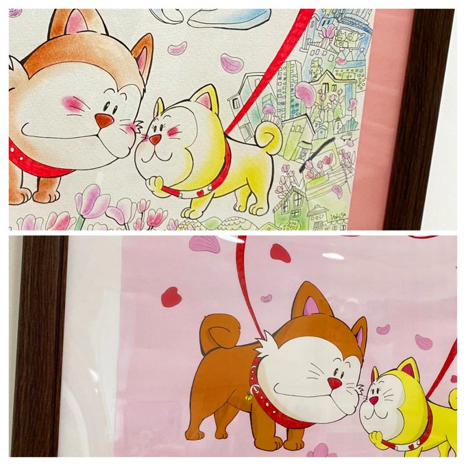 ラブラブわんこを描いてくださった福嶋さん🐶アナログ原画ver.とCG ver.を展示させていただいてます🐕💘なんとご希望の方にはこちらのプリントアウトをプレゼントしてくださるそうです✌️ほんわりした原画是非見ていただきたいです〜🐕💨