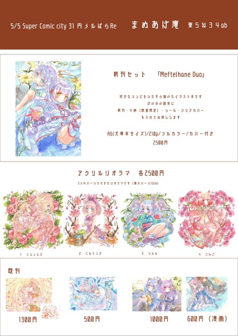 【5/5 SUPER COMIC CITY 31】メルぱらReにて頒布する本やグッズのサンプルとお品書きです〜!まめさんと合同サークルです🫘当日はよろしくお願いします🌸 #メルぱらRe #メルぱらRe頒布物