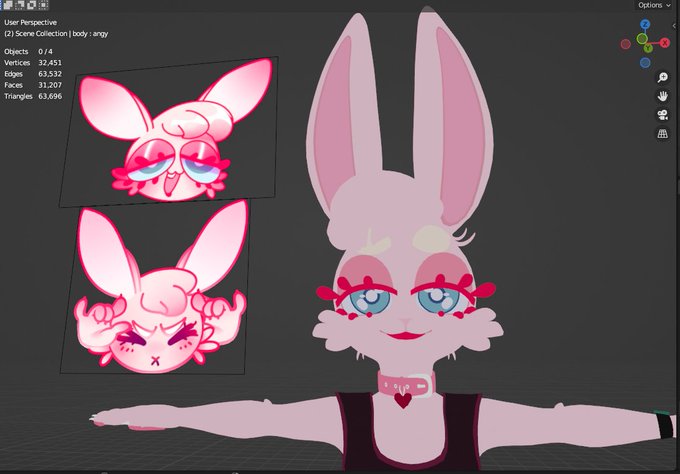 decided to scrap the head from last time's session and use my most recent doodles as mini references to make my new VRC model !! time to take it into substance painter soon. i am actually so ecstatic for this one omg. art/model all made by me #vrchat #blender #art