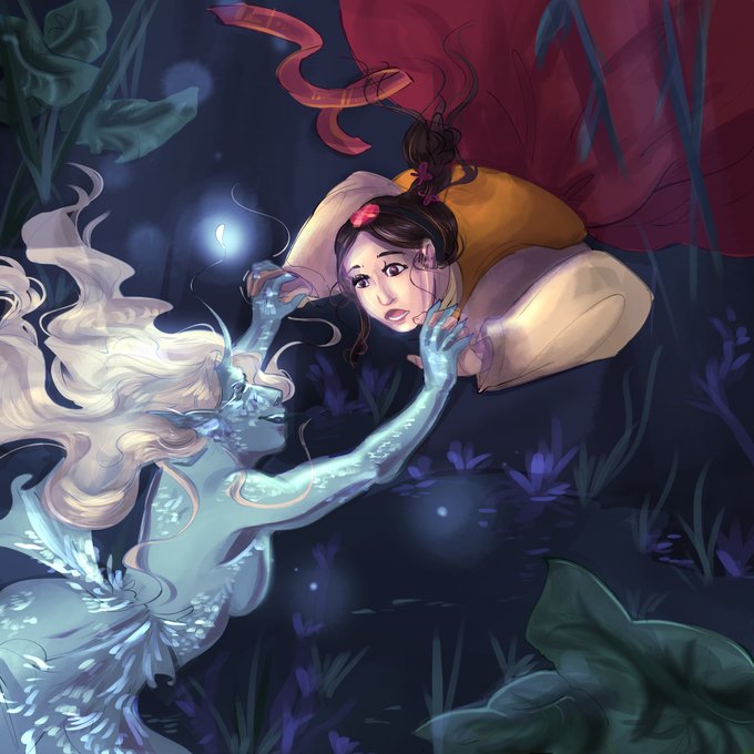 old class assignment from last year; illustrated a short series of images about a maiden falling in love with the creature in her pond 💙🎣