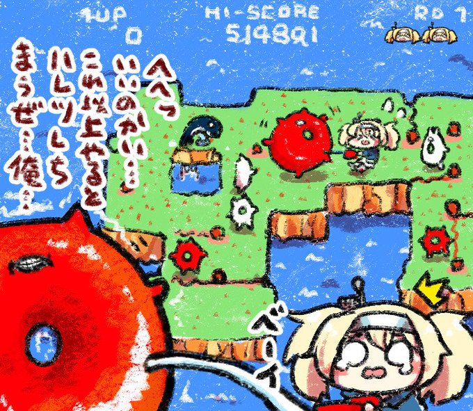 1人離島に辿りつくも深海浮輪達に襲われ運よく持っていた空気入れで応戦するも謎の覚悟で躊躇してしまう優しき艦娘ガンビア・ベイちゃんを描きました。