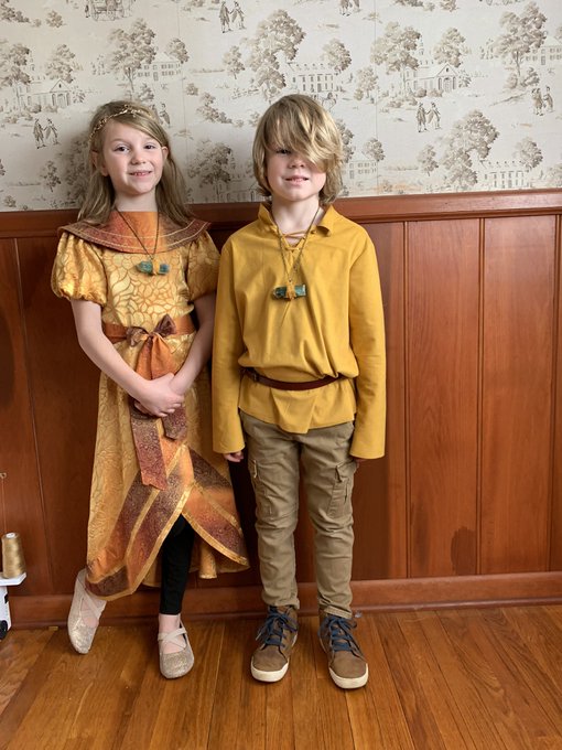 Totally normal morning of sending the kiddos to school dressed as their favorite book characters (Ana and Drake from @TraceyWestBooks Dragon Masters series).