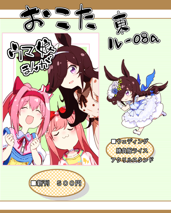 C103土曜 東ル08a『おこた』おしながきぺとり。 新刊「ウマ娘まんが」ウマ娘かわいいまんがに描き下ろしを加えたまとめ本、「ウェディングライスのアクスタ」になります。よろしくお願いします٩(ˊᗜˋ*)