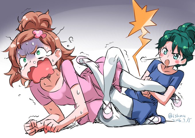 本日の、ストレッチの筈がなぜか四の時固めになったけどとても楽しいみなみさんとのバレエレッスンはるはる。 #プリキュア版深夜の真剣お絵描き60分一本勝負