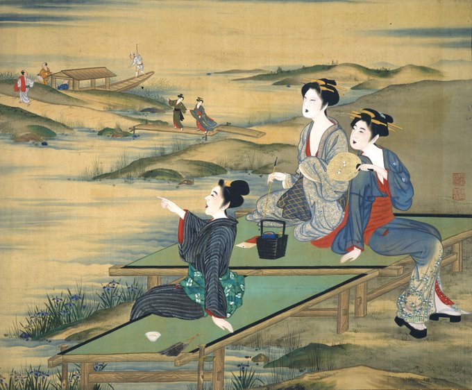 川辺で涼む女性たちをよく見ると下唇が緑色です。これは紅を重ね塗りして緑色にする高価な化粧(笹紅)をしているからです。女性たちの艶っぽさについ見とれてしまうとのこと。
