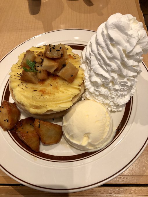 エッグスンシングス!二人で行くとコスパがとても良かった……このサイズのパンケーキ(このパンケーキは追加料金必要)とエッグベネディクトとサラダ(大盛り)とドリンク2つ(2つ!?)で一人2000円くらいのコースがある。とてもよい。美味しかった(´˘`*)