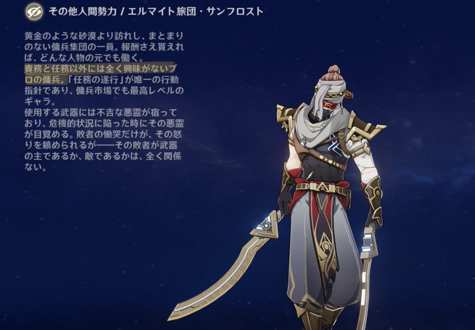 だらしない夢女なので砂漠にいるムキムキの敵キャラに恋してる 「責務と任務以外には全く興味がないプロ」 「この一族の戦士は、廃墟となった砂の都の古文と詩歌に精通している」 ↑これ良すぎる