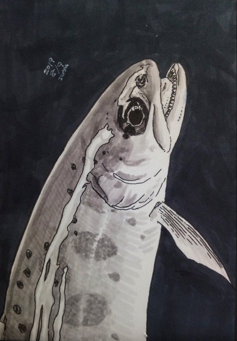開きの他にはこういう闇の深い絵を描いたりしてます。 3枚目のタイトルは「ヤマメの塩焼き」です。