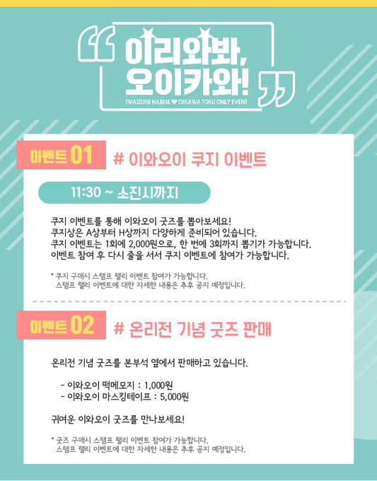 [알림] 온리전 당일 판매되는 기념 굿즈와 쿠지 이벤트에 대해 안내 드립니다. 굿즈 판매는 11시부터, 쿠지 이벤트는 11시 30분 부터 시작되니 이 점 참조 부탁 드립니다. 감사합니다!
