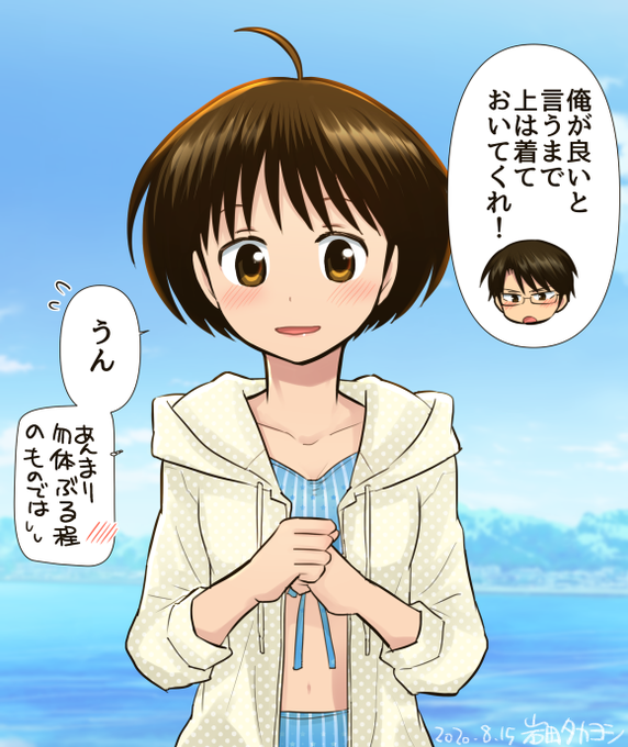 「ドはどんかんのド 番外編」の修正に関するお知らせをこの一つ前の投稿でしておりますので、ご購入して頂いている皆様には改めてそちらでご確認の程よろしくお願い申し上げます。 お詫び・・・という事ではないですが、今日はツグムの水着です(ラッシュガード付ですが)😅