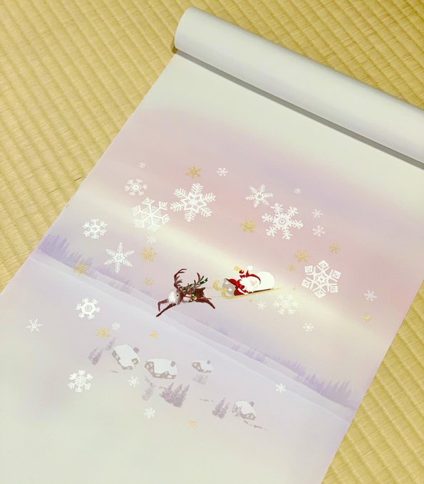 【新柄】クリスマスの新塩瀬帯「トナカイとサンタ」 グレー地 雪深い北欧の風景をイメージさせる背景に、サンタクロースがトナカイの引くそりに乗って雪の結晶とともに舞い降りる、そんなストーリーを感じさせる優しい印象の新塩瀬帯です。 #横浜高島屋 #京の名舗展 #井澤屋 #着物 #洗える #帯