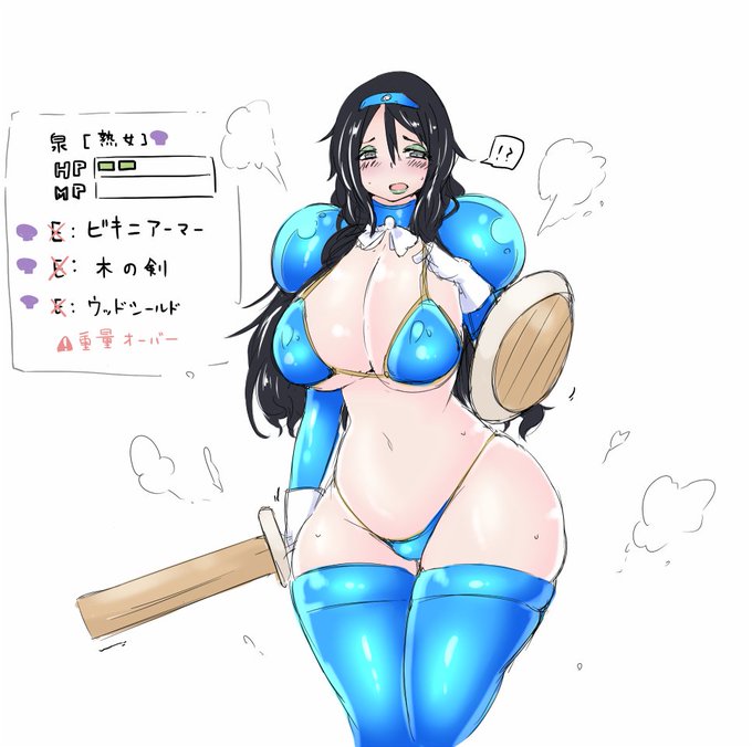 今日のお絵かきは、RPGの世界に取り込まれ、ビキニアーマーマダムにされてしまった挙句、あまりに低い持久力のせいで序盤のクエストすら息を切らしながらかけ出しパーティーについて行くイズミです