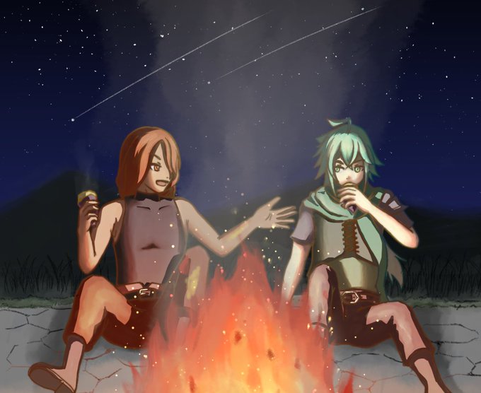 リクドウさん(@kai_rikudou_)の「悠久の蒼き聖樹」から、セージュ君とグレン君です。過去にも未来にも色々ありそうですが、こうして二人でたき火を囲んで芋を食べていてほしいという願望をそのまま絵にしてみました。