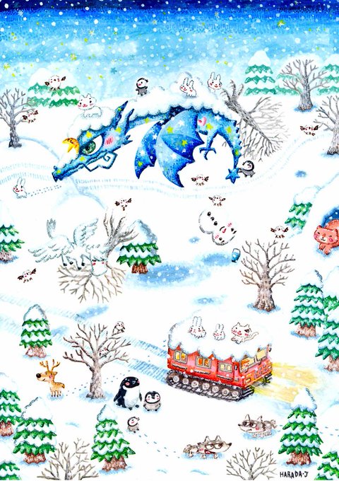 「雪上車上空に夜空ドラゴン」にはここ最近のこんな白銀世界は楽しそうだなぁ〰と思ったものを入れました⛄