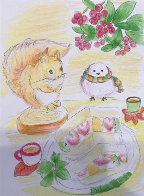 いつもお世話になってる方に差し上げた絵。甘いものと可愛い生き物の組み合わせって描くの楽しい。#色鉛筆画