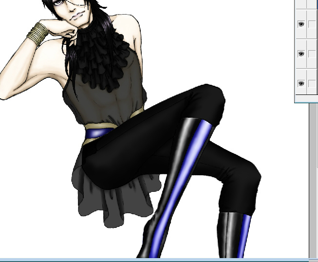 有彩色を適当にどんどん置いてみる。 センスの無さが浮き彫りになって悶絶(笑) ブーツからここら辺は特に小ワザとか無く、薄い色→中間→目標の色(本当にイメージしてる色)→陰 見たいな色をブラシの大きさ変えながら塗ってます。 #メイキング
