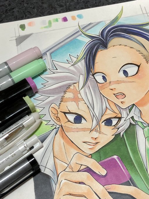 本日のお絵かき。夏の不死川実弥。友達の推し(インドの王様)を描くために褐色肌の練習中。兄ちゃんは犠牲になったのだ……。手持ちの色だけだとちょっと厳しいかなぁ?