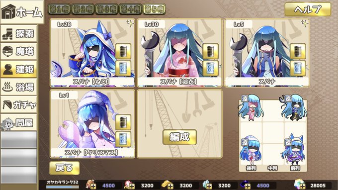 グヘヘへ! 浴衣姿と猫耳スパナを並べられるのはこれまた一興。 贅沢な要望だが、ブラウザ版の末期に配布してたBookLive!版スパナ(右)もアプリ版に出して貰えないだろうかな(^^) さすれば全員スパナなんて夢のパーティーを組めるんじゃないかと! (なお通常スパナはまだ持ってない模様)