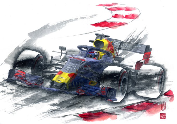 墨画の技法で描かれたレッドブル・レーシングのF1マシンのイラストも迫力満点です🏁