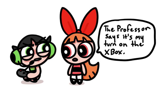 buttercup is playing halo 3 and blossom wants to play through the peggle demo again