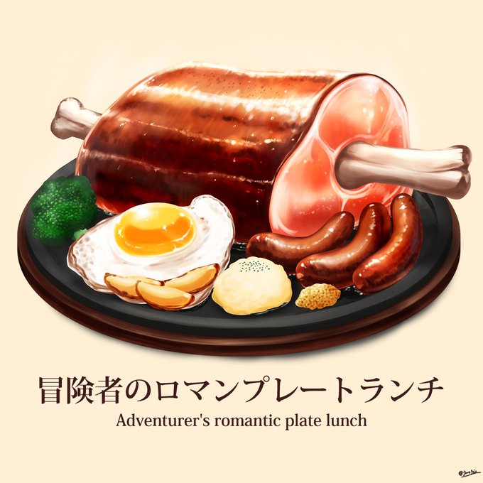 今日はいい肉の日!!! なのでドドン!と異世界グルメの 肉料理を再掲載!! 「ドラゴンテールのステーキ」!! 「暴君イノシシのハンバーグ」!! 「ワイバーンのモモ丸焼き」!! 「冒険者のロマンプレートランチ」だ~!!! #いい肉の日 #異世界グルメ